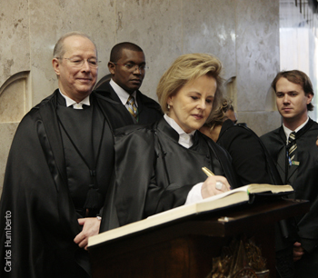 Na segunda-feira (19), em solenidade de breve duração, tomou posse a nova ministra do Supremo Tribunal Federal (STF), Rosa Maria Weber Candiota da Rosa, que assumiu a vaga deixada pela ministra Ellen Gracie, que se aposentou em agosto. O decreto de nomeação da ministra foi publicado na edição extra do Diário Oficial da União da última quinta-feira (15). Ela é a terceira mulher a integrar a Suprema Corte e completa o quórum de 11 ministros. Realizada no Plenário da Suprema Corte sob a presidência do ministro Cezar Peluso, a solenidade, que coincidiu com o encerramento do Ano Judiciário, teve início com a execução do Hino Nacional pela orquestra e coral Itaipu. Em seguida, a nova ministra foi conduzida ao Plenário pelo ministro Celso de Mello, decano do STF, e pelo ministro Luiz Fux, membro mais novo da Corte.