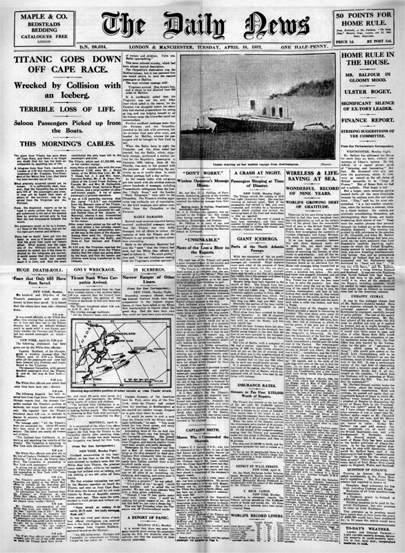 Deste sábado (14) para domingo, o mundo relembra os cem anos do naufrágio do navio Titanic. Sua história foi contada em livros, depoimentos e filmes. A redação deste semanário recebeu do professor José Francisco da Silva Porto, uma cópia da primeira página do jornal inglês The Daily News, de 16 de abril de 1912. O diário conta com detalhes o naufrágio e foi um dos primeiros jornais do mundo a dar com detalhes a colisão com o iceberg. O preço de capa do jornal era “one half-penny” e ele estampava a edição número 20.624, em formato germânico (38 centímetros de largura, divididos em 7 colunas). Este diário era editado em Londres e Manchester e estava em circulação há quase sessenta anos.