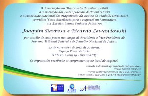 O Jornal Integração, através de seu editor, jornalista José Reiner Fernandes, agradece ao ministro Joaquim Barbosa, pela sua deferência especial ao enviar convite para sua posse na presidência do Supremo Tribunal Federal (STF), no dia 22 de novembro.