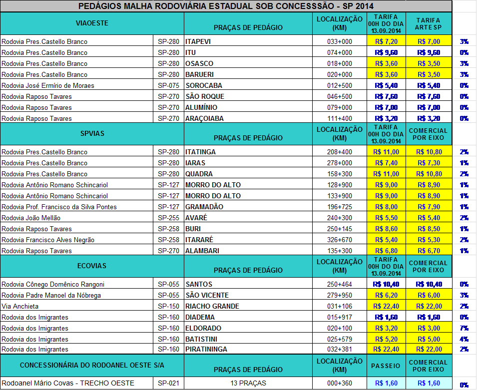São Paulo, 13 de agosto de 2014. O Tribunal de Justiça do Estado de São Paulo suspendeu as decisões liminares em favor das concessionárias CCR/ViaOeste (responsável pelo Sistema Castello Branco/Raposo Tavares), CCR/SPVias (que administra parte da Rodovia Raposo Tavares, entre outras), CCR/Rodoanel (Trecho Oeste do Rodoanel) e Ecovias (Sistema Anchieta/Imigrantes). As liminares permitiam o reajuste das tarifas de pedágio nas praças sob responsabilidades dessas concessionárias com porcentual acima do definido pelo Governo do Estado em 1º de julho.