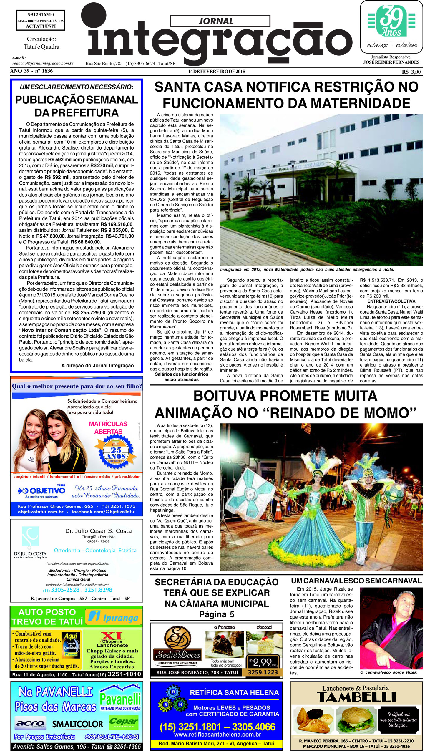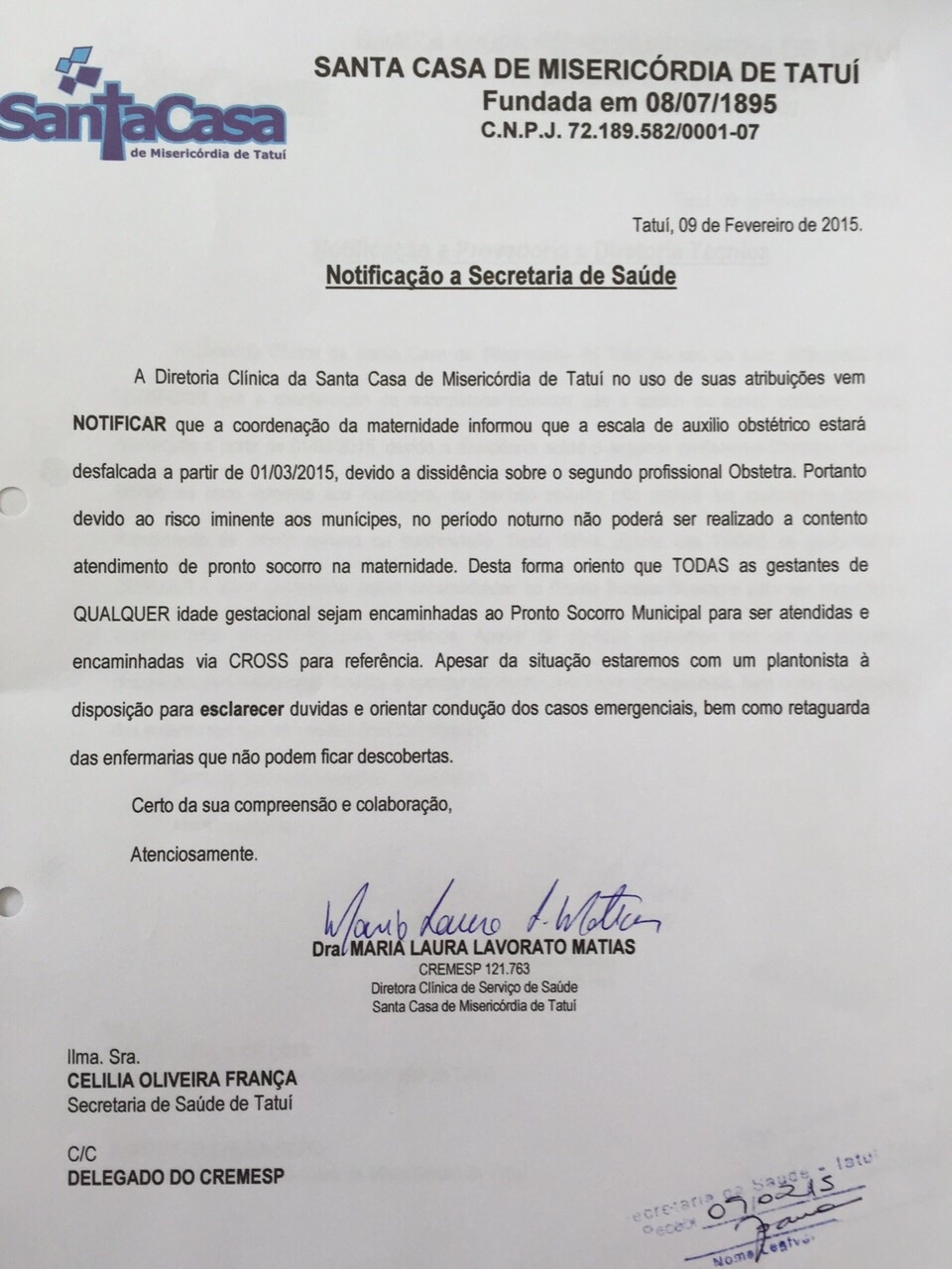 Jornal Integração (14/2/2-15) – A crise no sistema da saúde pública de Tatuí ganhou um novo capítulo esta semana. Na segunda-feira (9), a médica Maria Laura Lavorato Matias, diretora clínica da Santa Casa de Misericórdia de Tatuí, protocolou na Secretaria Municipal de Saúde, ofício de “Notificação à Secretaria de Saúde”, no qual informa que a partir de 1º de março de 2015, “todas as gestantes de qualquer idade gestacional sejam encaminhadas ao Pronto Socorro Municipal para ser atendidas e encaminhadas via CROSS (Central de Regulação de Oferta de Serviços de Saúde) para referência”.