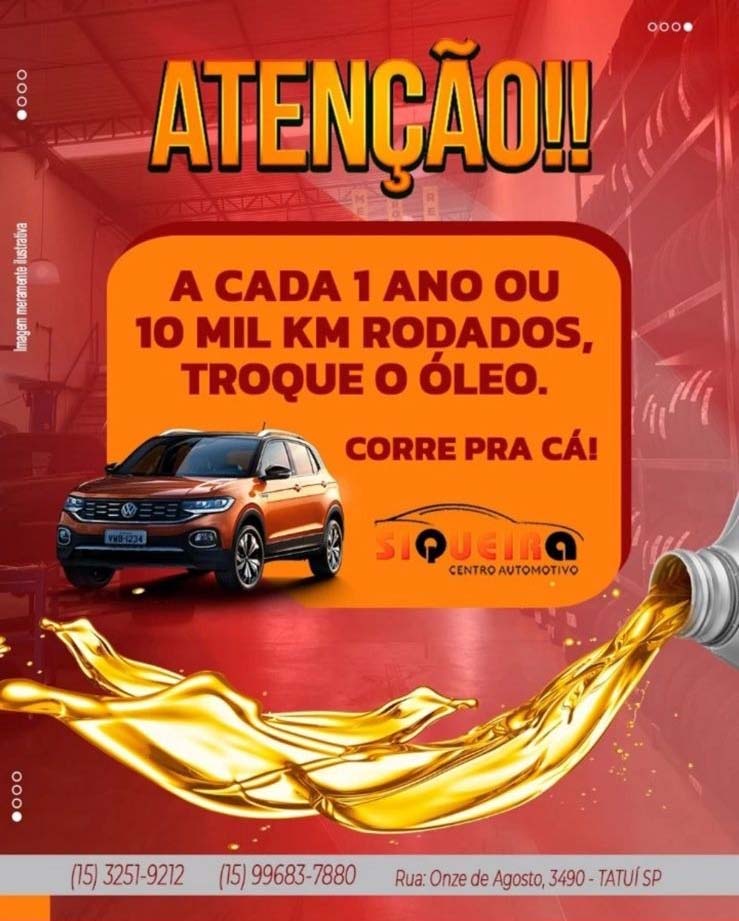Felipe Siqueira explica que dentro da sua embalagem original, o óleo do motor pode durar, em média, cinco anos. Mas, depois que ele começa a ser utilizado, esse prazo de validade se reduz para, no máximo, 12 meses. Felipe recomenda a troca do óleo a cada 1 ano ou 10 mil Km rodados. Este serviço faz parte do processo de manutenção preventiva, aumenta a confiança e segurança do veículo. Para cuidar da manutenção do seu veículo, corre para a Siqueira Centro Automotivo e confira a promoção do mês! Siqueira Centro Automotivo. Rua 11 de Agosto, 3.490. Tatuí. Fone: (15) 3251-9212 e (15) 99683-7880.