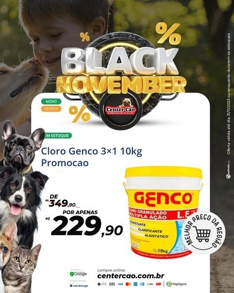 CENTER CÃO – Black November – Ofertas Incríveis para sua Piscina! Encontre as melhores ofertas e descontos em tudo o que você precisa para manter sua piscina limpa, segura e pronta para se refrescar. Cloro e produtos químicos de alta qualidade. Equipamentos de limpeza e manutenção. Acessórios divertidos para piscinas. Produtos de segurança e bem-estar. Não perca essa oportunidade de economizar e garantir que sua piscina seja o centro das atenções nos dias ensolarados. Aproveite as ofertas da Black November e mergulhe na diversão ! Atenção PREÇO PROMOCIONAL: Cloro Genco 3×1, 10 kg de R$ 349,90, por apenas R$ 229,90. VÁLIDO Só para compras pelo site: www.centercao.com.br. Não deixe escapar essas ofertas! #BlackNovember #ProdutosDePiscina #VerãoDivertido #PiscinaLimpaESegura #Centercão #Petshop #Entrega Grátis. ,Avenida Salles Gomes, 156, Tatuí.