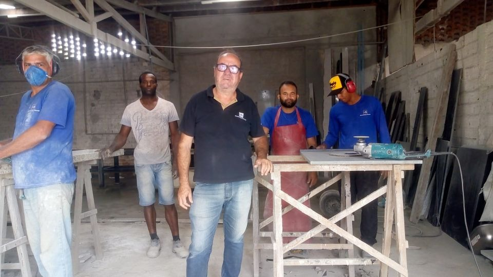 Galpão onde os projetos ganham vida e os sonhos viram realidade. João Soares, na foto, juntamente com sua equipe, Maranhão, Décio, Diego e Giam, verdadeiros artistas, que moldam mármores e granitos. E garantem um toque final de arte no acabamento dos seus projetos. Marmoraria Soares. Rua Teófilo Andrade Gama, 1000. Tatuí. Fone (15) 99198-1308.