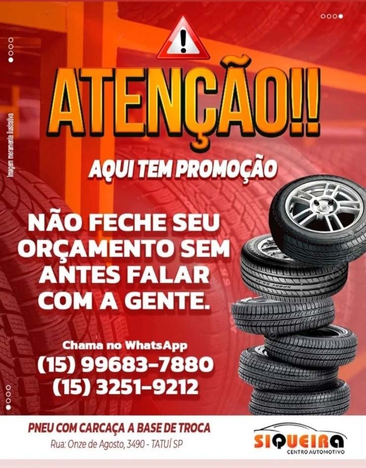 Atenção!!! Aqui tem promoção! Felipe Siqueira, da Siqueira Centro Automotivo, explica que na hora de comprar Pneus para seu carro, você não deve fechar seu orçamento, sem antes falar com seu pessoal. Na loja tem promoção com o melhor preço e as melhores condições. Corra para a Siqueira Centro Automotivo e confira a promoção do mês! Rua 11 de Agosto, 3.490. Fones: (15) 3251-9212 e (15) 99683-7880.