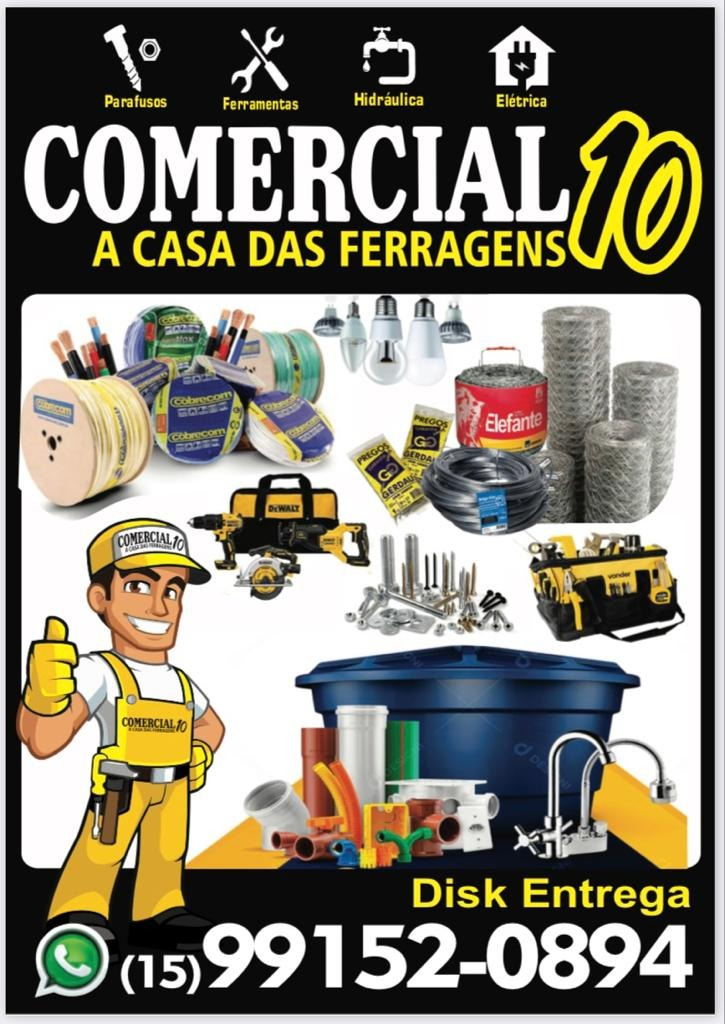 Aqui na Comercial 10 você encontra as melhores marcas, com os melhores preços da região em materiais elétricos, hidráulicos, ferramentas e parafusos. Vem pra comercial 10! WhatsApp: (15) 99152-0894. Rua 11 de Agosto, 2.332, Ao lado da SOLAR DEZ.