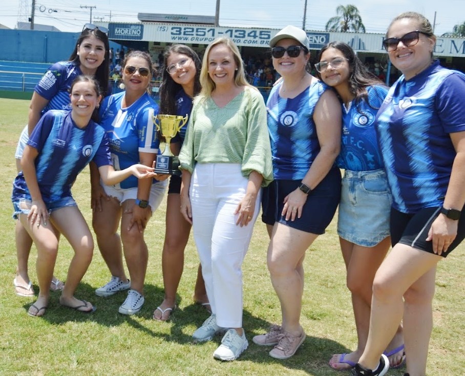 As representantes da torcida feminina do Gert recebem o troféu no gramado do Estádio “Itatibão”.