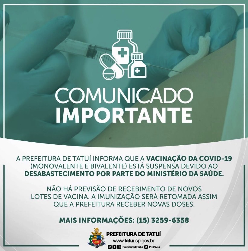 No final da tarde da quinta-feira (11), a Prefeitura de Tatuí publicou comunicado nas redes sociais, informando que a vacinação contra a Covid-19 (monovalente e bivalente) foi suspensa, “devido ao desabastecimento por parte do Ministério da Saúde”. O comunicado cita também que “não há previsão de novos lotes da vacina” e “a imunização será retomada assim que a Prefeitura receber novas doses”.