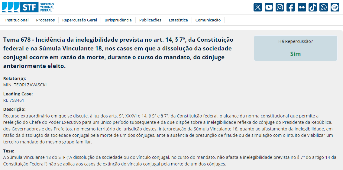 No Tribunal Superior Eleitoral (TSE), o Agravo Regimental no Recurso Eleitoral 177-20/MG, de relatoria do Ministro Luiz Fux, em decisão unânime da corte eleitoral, prevalece o Acórdão: “ELEIÇÕES 2016. AGRAVOS INTERNOS. RECURSO ELEITORAL ESPECIAL. REGISTRO DE CANDIDATURA. DEFERIDO. CARGO PREFEITO. ART. 14, PARÁGRAFOS 5º e 7º, DA CONSTITUIÇÃO FEDERAL DA REPÚBLICA. CANDIDATA CÔNJUGE DE PREFEITO REELEITO FALECIDO NO CURSO DO SEGUNDO MANDATO. DISSOLUÇÃO DO VÍNCULO CONJUGAL POR MORTE AFASTA A INCIDÊNCIA DA INELEGIBILIDADE REFLEXA SOBRE O CÔNJUGE SUPÉRTITE. ENTENDIMENTO DO SUPREMO TRIBUNAL FEDERAL (RE N. 758461/PB). INELEGIBILIDADE NÃO INCIDENTE. AGRAVOS DESPROVIDOS”.