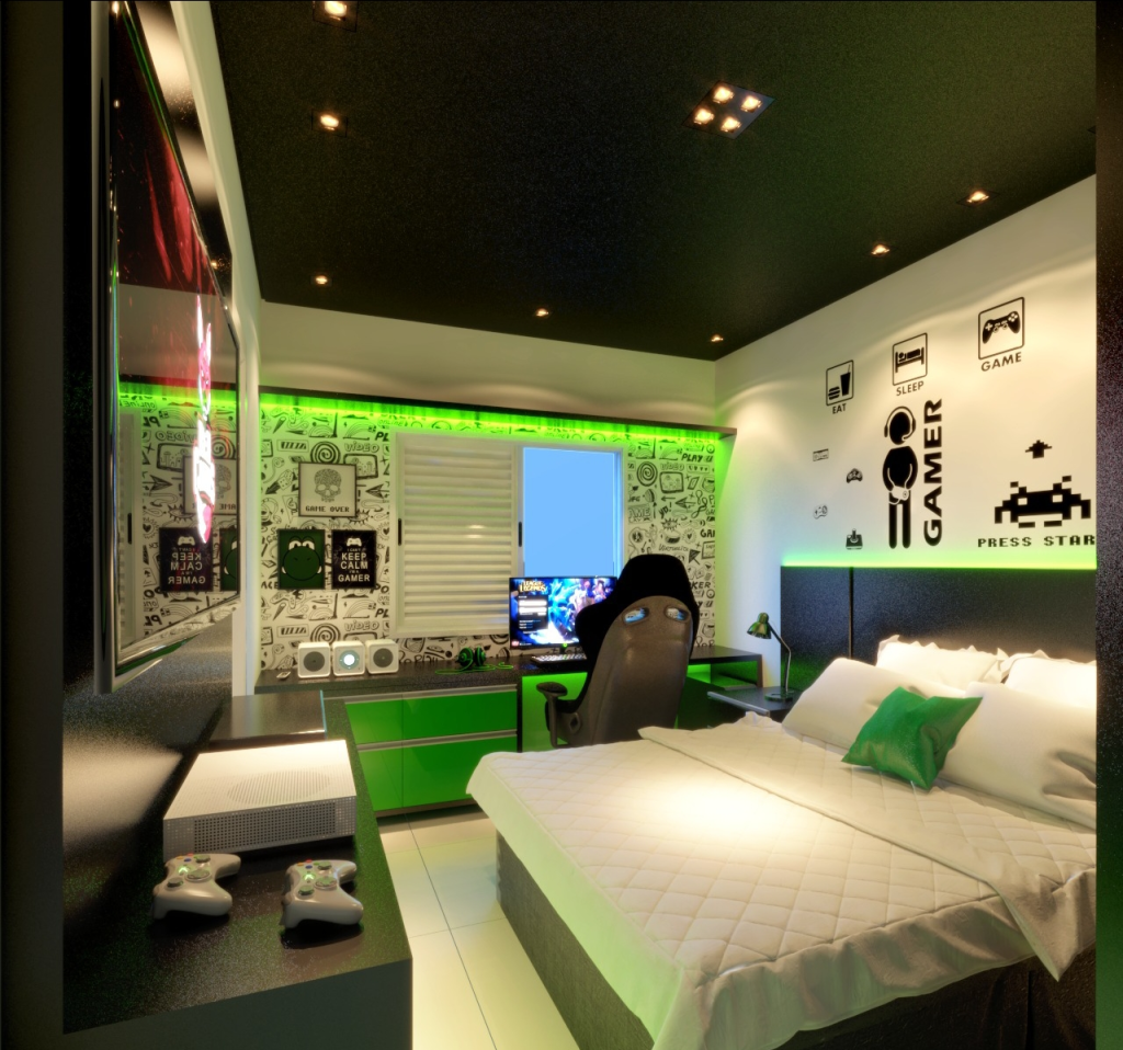 Júlio explica que no quarto gamer além da iluminação principal do cômodo, você também pode usar luminárias de mesa, de chão e as fitas de LED. Elas podem ser coladas atrás de móveis, do monitor, embaixo da mesa, entre outros locais. Esse tipo de iluminação é uma das principais coisas que caracteriza um cantinho gamer. Decorá-lo de forma bela e funcional pode otimizar todo o ambiente! Sorral Ambientes Planejados. WhatsApp: (15) 97407-7674 e (15) 99697-2626. projeto@sorralplanejados.com.br.