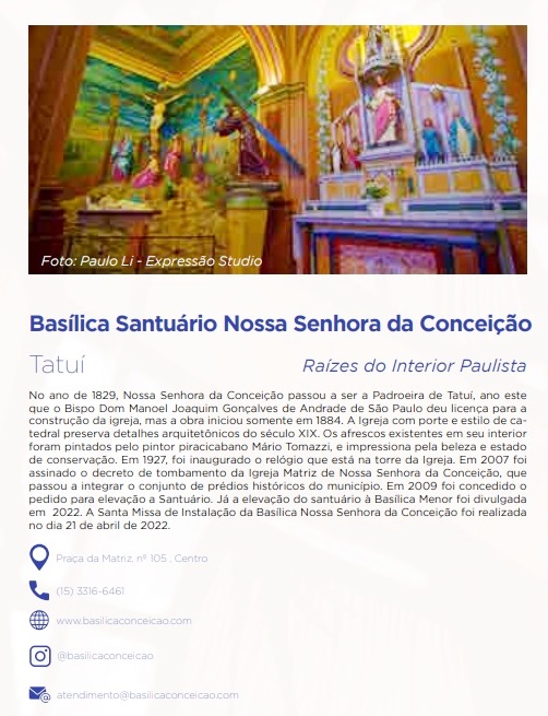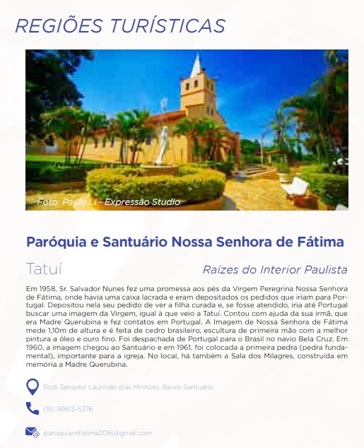 O município de Tatuí, integrante da região turística “Raízes do Interior Paulista”, está representado na publicação através da Basílica Santuário de Nossa Senhora da Conceição e da Paróquia Santuário de Nossa Senhora de Fátima, situada no Bairro Santuário. O guia traz o endereço das igrejas, telefone e e-mail para contato e as redes sociais.