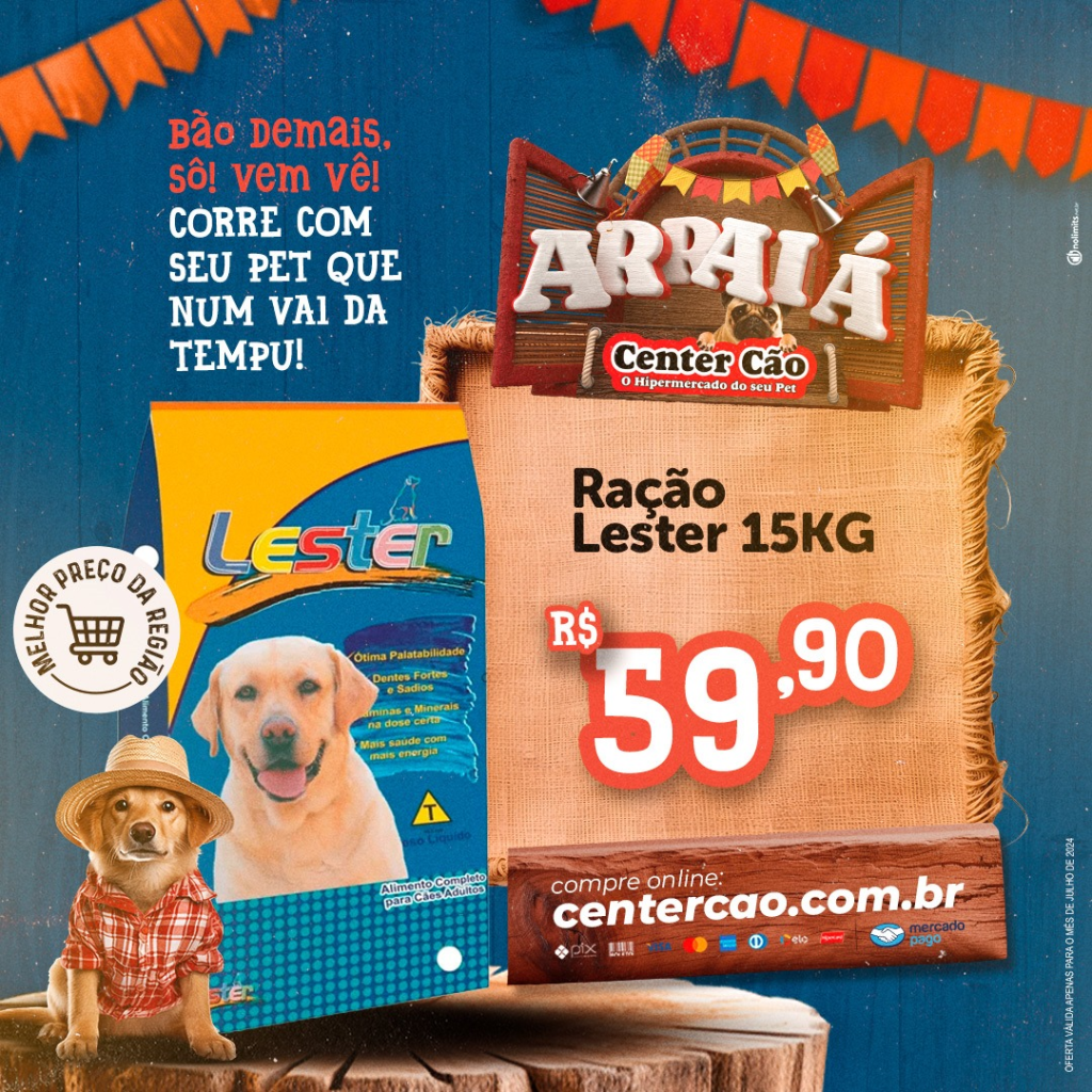 Marcelo convida você para o Arraiá da Center Cão. Confira a Festa: Lester Carne 15kg agora por apenas R$59,90! Desfrute de uma refeição premium para o seu amigo peludo a um preço irresistível! Aproveite antes que acabe! Benefícios da Ração Lester Carne: Alta digestibilidade para melhor absorção de nutrientes – Ingredientes selecionados para uma saúde superior – Ideal para cães adultos de todas as raças. Promoção válida até 31/07. Não perca! Preço exclusivo para compras no site: http://www.centercao.com.br. #ArraiáDeOfertas #LesterCarne #AlimentaçãoPremium #CãesAdultos #CenterCão