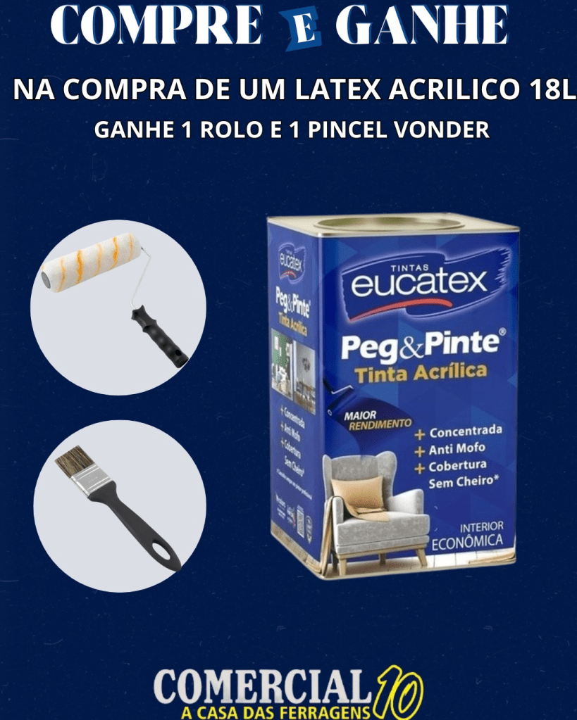 Stelvio Cleto, gerente da Comercial 10, informa que em sua loja você compra e ganha! Na compra de 1 lata de Tinta Eucatex você ganha um rolo e um pincel de graça. Vem pra Comercial 10 que é certeza do melhor negócio. WhatsApp: (15) 99152-0894. Rua 11 de Agosto, 2332, Tatuí.