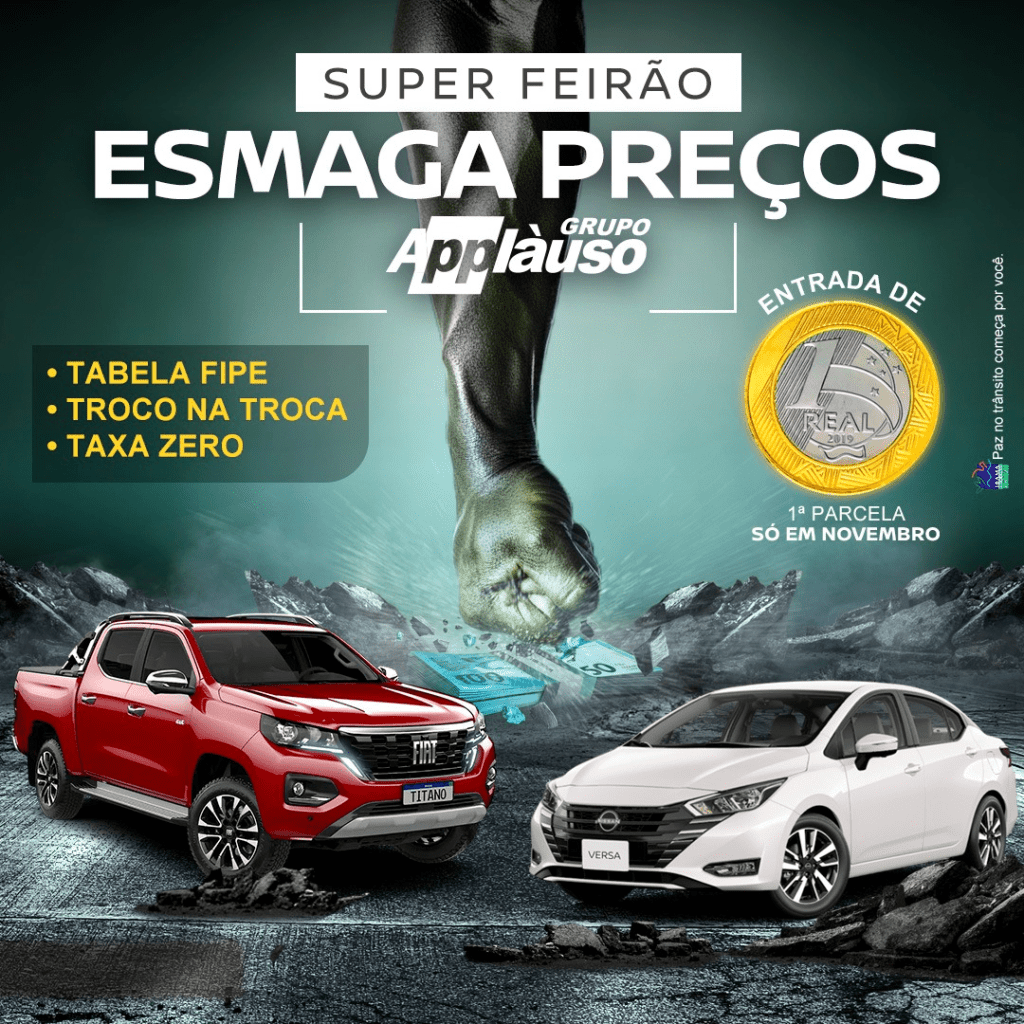 Condições arrasadoras para detonar a concorrência. Tem taxa zero, tabela fipe, troco na troca, entrada a partir de um real ou primeira parcela para novembro. O diretor enlouqueceu! Super Feirão esmaga preços. GRUPO APPLAUSO. Somente neste sábado 17/8, a partir das 9h00. Rua 11 de Agosto, 3680 – Tatuí.