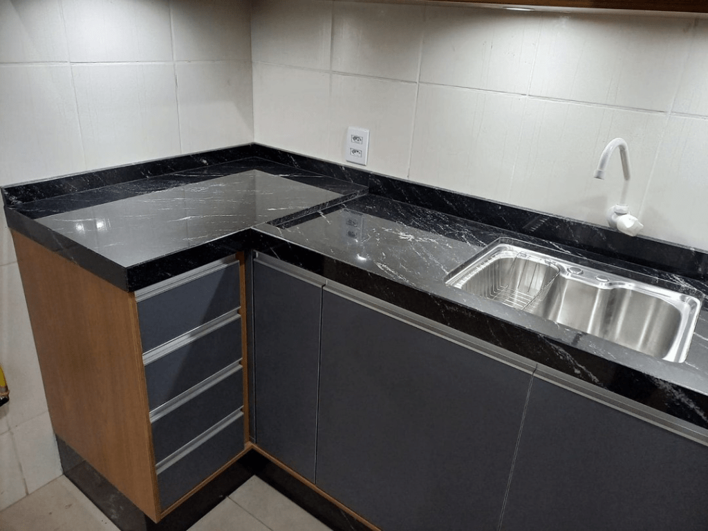 João Francisco, proprietário da Marmoraria Soares, informa que se você procura as mais belas pedras de mármore ou granito, para dar o melhor acabamento em sua casa, seu estabelecimento é o local ideal. Na foto, pia e sapata feita no granito preto Via Láctea. Uma pedra dos tons de preto mais bonitos, pelo brilho que tem. Dá ar de sofisticação no ambiente de trabalho e é feito com muito amor e dedicação, como tudo que fazemos. O trabalho começa desde a medição, corte, colagem e acabamento perfeito! Os produtos para o novo visual da sua casa estão na Marmoraria Soares. Rua Teófilo Andrade Gama, 1000, Tatuí. Fone: (15) 99198-1308.