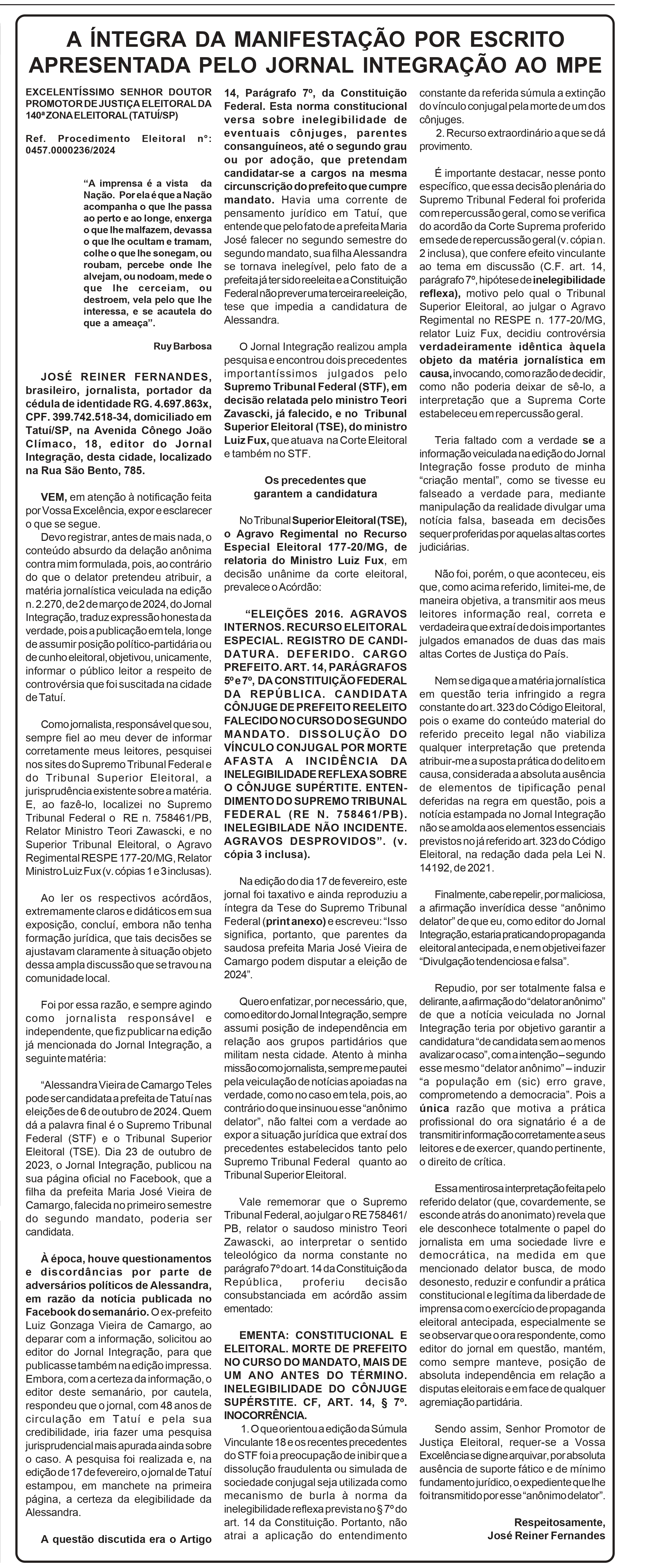 O semanário explica ainda que os boatos espalhados pela cidade, sobre a suposta inelegibilidade da cidadã Alessandra Vieira de Camargo Teles, levaram o jornal a consultar jurisprudências das mais altas Cortes de Justiça do Brasil, para informar corretamente os leitores. No entanto, esta notícia, com certeza, não agradou o “espalhador de boatos”. E, ao agir de forma covarde, ao utilizar o expediente da “delação anônima”, levou ao conhecimento do Ministério Público Eleitoral a matéria veiculada, com acusação infundada de tratar-se de “notícia falsa”. Naquele momento político de Tatuí, o que se especulava era que se Alessandra poderia sair candidata, pois a morte de sua mãe, Maria José Vieira de Camargo, no cargo de prefeita e reeleita, supostamente, impediria sua candidatura, sob a alegação de que seria uma terceira reeleição. Para responder ao Procedimento Preparatório Eleitoral, o jornalista José Reiner Fernandes encaminhou ao MPE, argumentos convincentes de que o Jornal Integração, para publicar essa notícia, se baseou no “RECURSO EXTRAORDINÁRIO 758.461”, julgado pelo Supremo Tribunal Federal (STF), “REPERCUSSÃO GERAL NO RECURSO EXTRAORDINÁRIO 758.461”, também julgada pelo STF, e no “AGRAVO REGIMENTAL NO RECURSO ESPECIAL ELEITORAL N° 177-20. 2016.6.13.0167”, julgado pelo Tribunal Superior Eleitoral. Todos esses julgados, pelas mais altas cortes de Justiça do Brasil, são unânimes em reconhecer que: