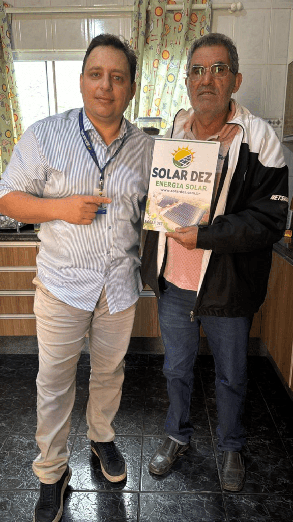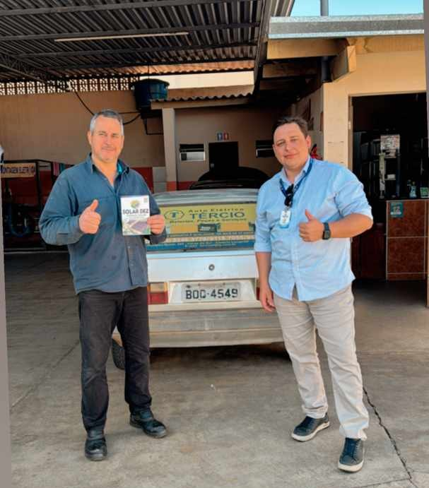 Novos clientes da Solar Dez já economizam e produzem energia limpa, ajudando a tornar o planeta mais sustentável. Nas fotos o proprietário, William Fiusa com Vicente Soares, de Porangaba, e na Auto Peças Tércio, em Cesário Lange.