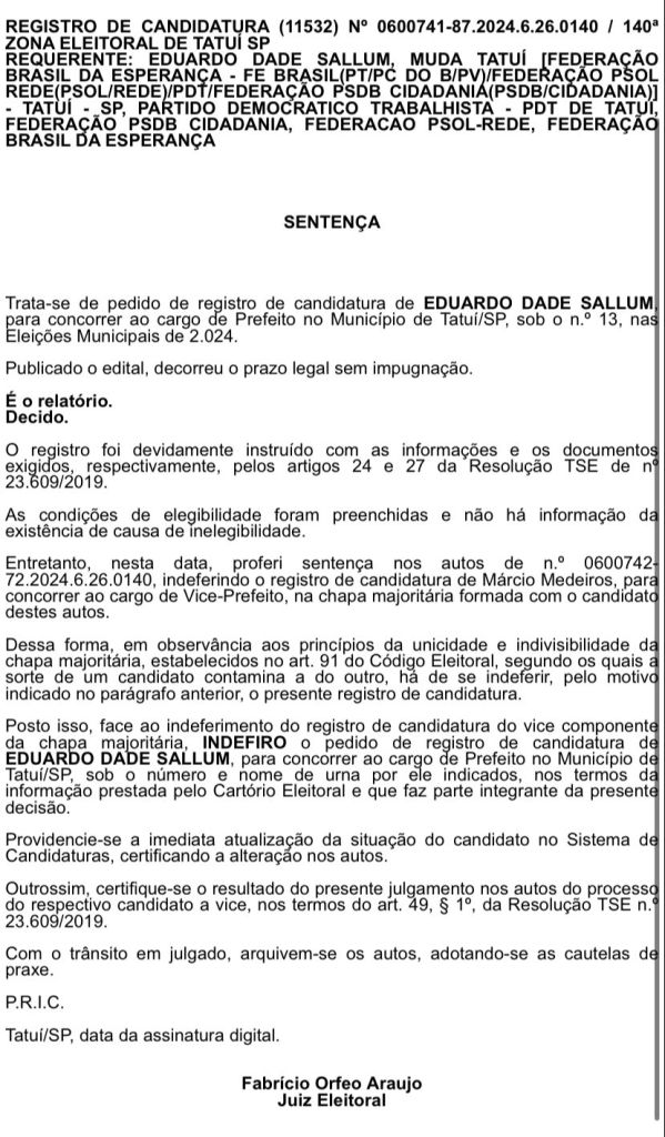 Decisão prolatada pelo juiz eleitoral Fabricio Orfeo Araújo indeferiu a candidatura de Eduardo Dade Sallum, postulante ao cargo de prefeito de Tatuí pela legenda do PT. A medida judicial é em razão da impugnação da candidatura de Márcio Medeiros, vice-prefeito na chapa petista. De acordo o juiz eleitoral, “em observância aos princípios da unicidade e indivisibilidade da chapa majoritária, estabelecidos no artigo 91 do Código Eleitoral, segundo os quais a sorte de um candidato contamina a do outro, há de se indeferir, pelo motivo indicado no parágrafo anterior, o presente registro de candidatura”. Na página da Justiça Eleitoral, Eduardo Sallum aparece como “indeferido em prazo recursal ou com recurso”. Da decisão em primeira instância eleitoral ainda cabe recurso. Segundo consta, o Partido dos Trabalhadores (PT) de Tatuí, deve escolher um novo candidato a vice-prefeito para compor a chapa.