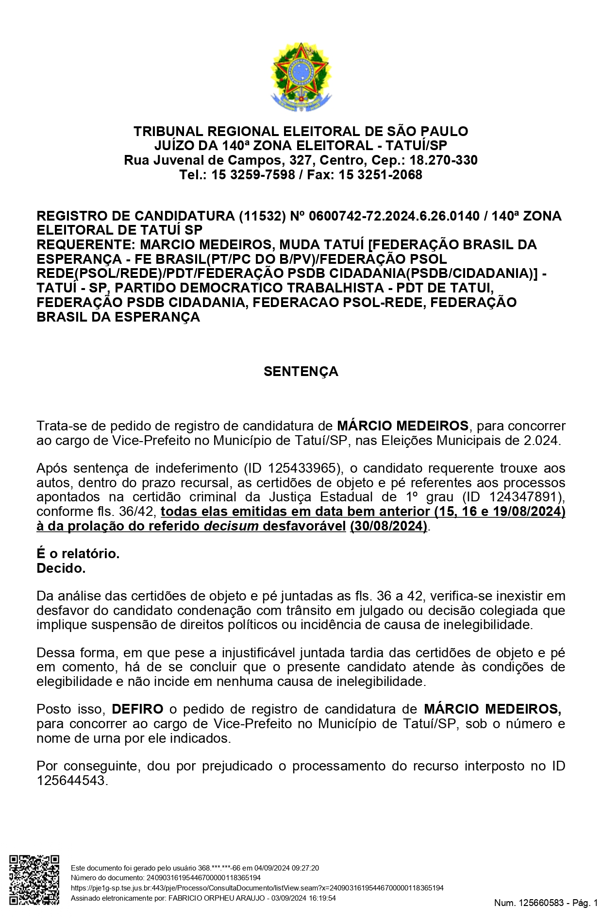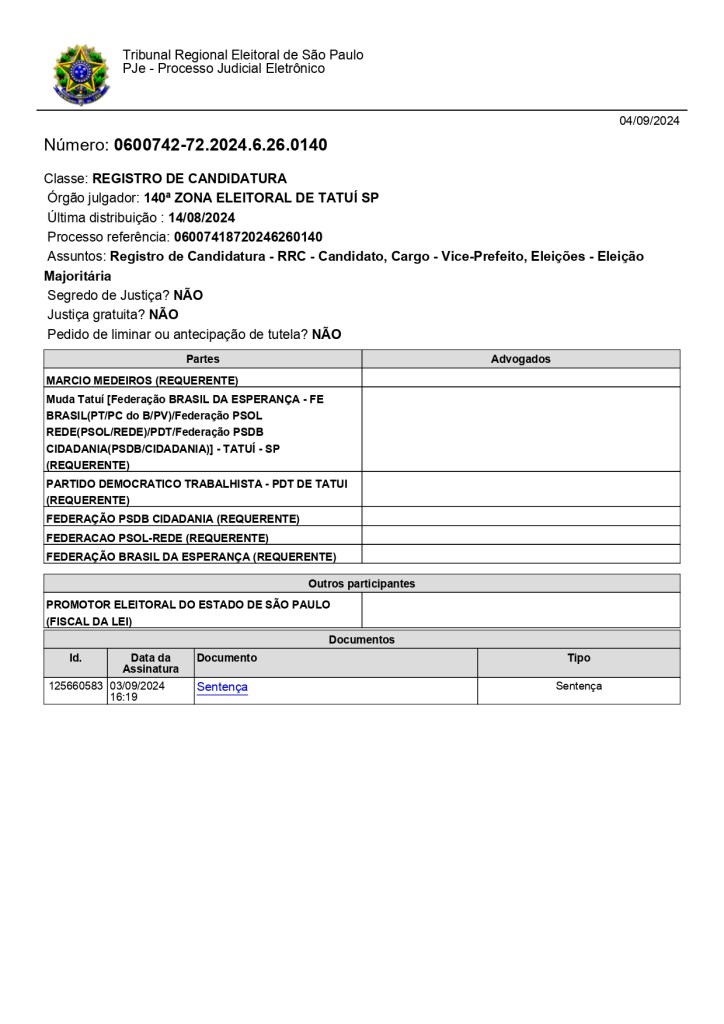 Em sua decisão o magistrado argumenta que “Após sentença de indeferimento (ID 125433965), o candidato requerente trouxe aos autos, dentro do prazo recursal, as certidões de objeto e pé referentes aos processos apontados na certidão criminal da Justiça Estadual de 1º grau (ID 124347891), conforme fls. 36/42, todas elas emitidas em data bem anterior (15, 16 e 19/08/2024) à da prolação do referido decisum desfavorável (30/08/2024)”. Acrescenta o juiz eleitoral: “Da análise das certidões de objeto e pé juntadas as fls. 36 a 42, verifica-se inexistir em desfavor do candidato condenação com trânsito em julgado ou decisão colegiada que implique suspensão de direitos políticos ou incidência de causa de inelegibilidade”. E conclui: “Dessa forma, em que pese a injustificável juntada tardia das certidões de objeto e pé em comento, há de se concluir que o presente candidato atende às condições de elegibilidade e não incide em nenhuma causa de inelegibilidade. Posto isso, DEFIRO o pedido de registro de candidatura de MÁRCIO MEDEIROS, para concorrer ao cargo de Vice-Prefeito no Município de Tatuí/SP, sob o número e nome de urna por ele indicados”.
