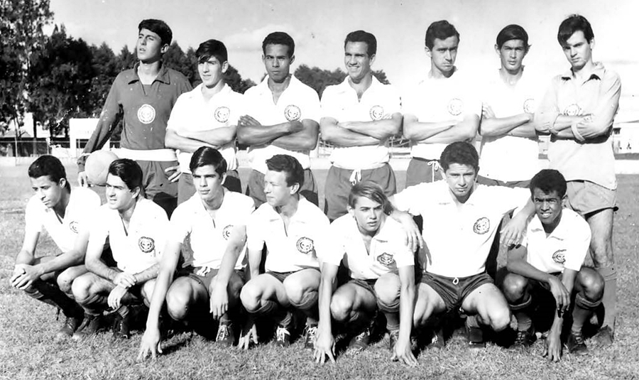 A fotografia acima, retirada de nossos arquivos digitais, foi registrada em maio de 1967, no Estádio “Dr. Gualter Nunes”, do XI de Agosto, e nos mostra a equipe “Nosso Banco”. O time foi formado pelo respeitado zagueiro Nei Perches, e durante um bom tempo, conquistou brilhantes vitórias nos gramados da cidade e região. Esta imagem foi clicada antes da partida amistosa contra o Derac de Itapetininga. Os tatuianos golearam os visitantes pela contagem de 5×1, com três tentos de Monteiro, um de Chiquinho e um de Ademir Biguá. Confira o elenco: em pé, da esquerda para a direita, vemos os atletas Guilherme, Carlinho Tavares, Gui, Nei Perches, Edno Galvão (Pinóquio), Carlinho e Ari Hoffmann. Nesta mesma ordem, agachados, estão Monteiro, Roberto Sunta, Tirson, Chico Fiuza (Chiquinho Suã), Taliba (Adib Millen), Heitor Soares e Ademir Biguá. Infelizmente, diversos craques que aí aparecem já nos deixaram. O tempo passa, lá se vão 57 anos de saudades…