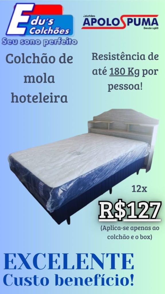 Eduardo Spesia conta que na Edu’s Colchões você encontra a Linha de hotelaria Apolo Spuma que ajuda os hotéis a proporcionar aos seus hóspedes uma inesquecível experiência de descanso. Aproveite a promoção: Colchão de mola hoteleira, resistência de até 180 kg por pessoa, excelente custo benefício! Em promoção colchão e box por 12x de R$ 127,00. Venha-nos fazer uma visita. Rua 11 de Agosto, 866, Centro, Tatuí-SP. Fone: (15) 3259-0006 ou WhatsApp: (15) 99243-2844. Em frente a igreja São Roque. Edu’s Colchões seu sono perfeito.