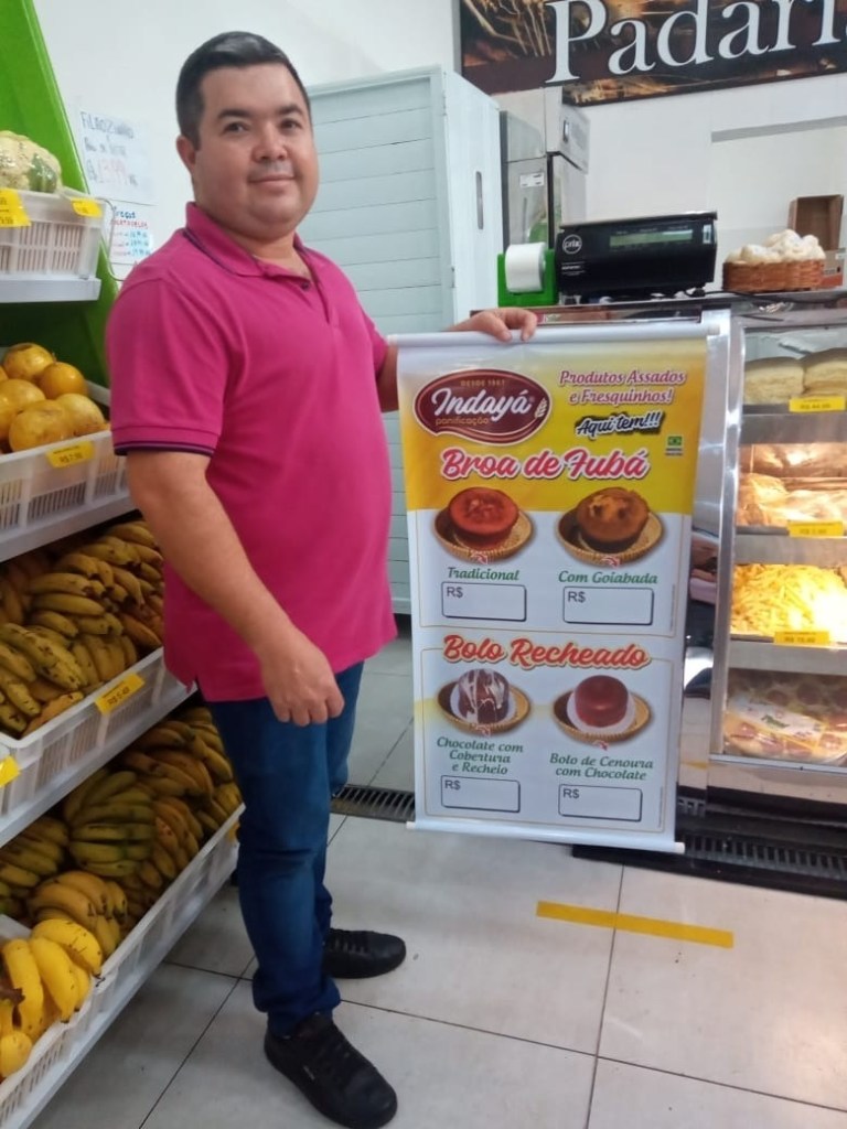 Roberto Vieira (foto) do Supermercado Vieira. O estabelecimento revende a linha completa de produtos Indayá. Pães e biscoitos doces e salgados, broas de fubá tradicional ou com goiabada, bolo recheado de chocolate com cobertura e recheio ou bolo de cenoura com chocolate, e outros alimentos que fazem parte da linha de fabricação da marca mais deliciosa de Tatuí. O Supermercado Vieira fica na Rua Olinda Leite Sinisgali, 65 – Jardim Rosa Garcia 1 – Tatuí. Fone: (15) 3251-9857.
