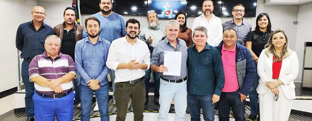 Celso Rodrigues (Celsinho) ao lado dos vereadores, segura uma cópia do projeto aprovado.