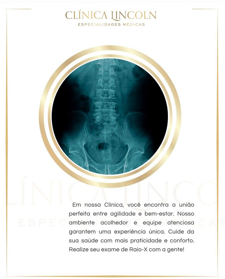 Na Clínica Lincoln Especialidades Médicas, você encontra a união perfeita entre agilidade e bem estar. Nosso ambiente acolhedor e equipe atenciosa garantem uma experiência única. Cuide da sua saúde com mais praticidade e conforto. Realize seu exame de Raio-x com a gente! Rua 15 de Novembro, 632, Tatuí, Fones: (15) 99852-5656 e 3251-4800.