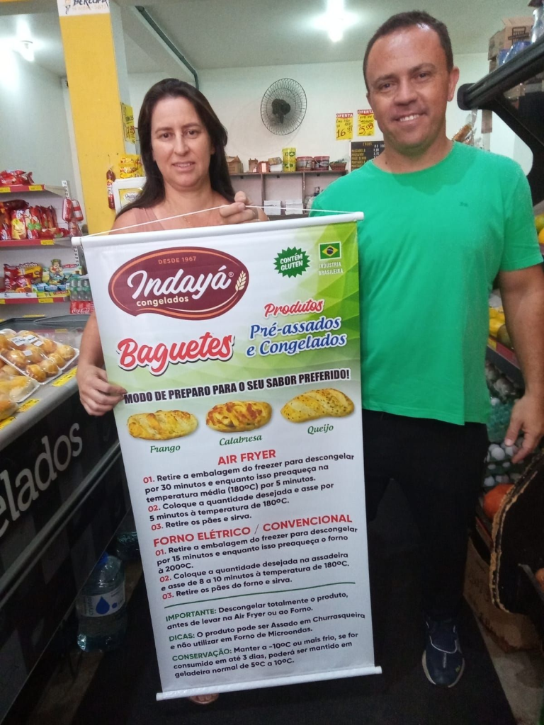 Na foto, Aline e Edinho, proprietários do Mercado Família, o estabelecimento está participando do lançamento da nova linha de Baguetes da Indayá, produtos pré-assados e congelados que agora chegam quentinhos na sua mesa em 3 deliciosos sabores, frango, calabresa e presunto e queijo, ou se você preferir a natural, sem recheio. Os produtos podem ser assados na Air Fryer, no forno e até na churrasqueira, uma verdadeira delícia! O Mercado Família fica na Rua Chiquinha Rodrigues, 884 – Tatuí. Fone: (15) 99672-1144.