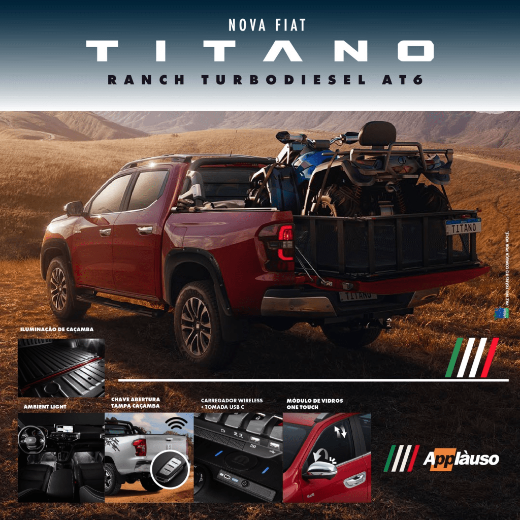 “Conheça a Nova Fiat Titano Ranch Turbodiesel AT6 – a força que você precisa para ir além! Com iluminação de caçamba, chave de abertura para tampa traseira, carregador wireless com tomada USB-C e muito mais, ela é perfeita para quem busca potência e sofisticação em uma só picape. E o melhor: essas condições exclusivas você só encontra na Fiat Applàuso! Mas atenção: é por tempo limitado! Visite a Fiat Applàuso em Tatuí: Rua 11 de Agosto, 3680 – Fone: (15) 3322-3770. Estamos prontos para te atender e realizar o seu sonho de ter a Nova Fiat Titano na garagem.