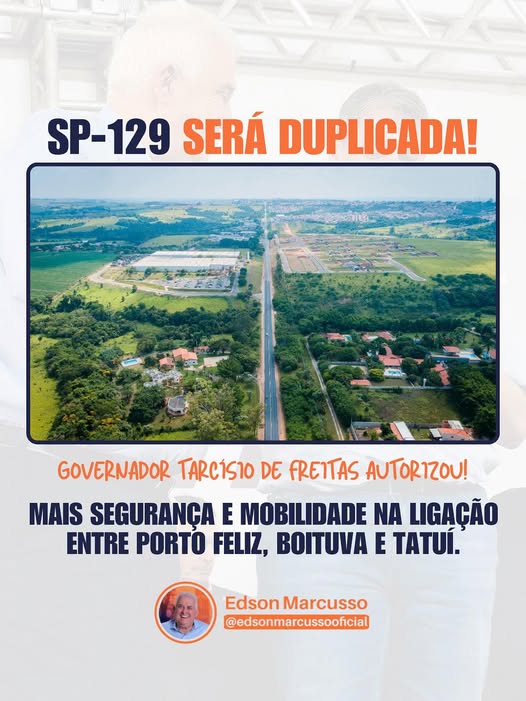 Dia 6 de agosto, o prefeito Edson Marcusso, de Boituva, anunciou a duplicação da Rodovia SP-129, que liga Porto Feliz, Boituva e Tatuí, com investimento de R$ 200,6 milhões do Governo do Estado.