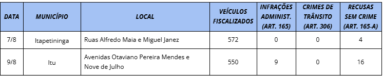 Dia 12 de agosto, o Detran-SP informou que nas últimas semanas foram realizadas operações contra alcoolemia nas cidades de Itapetininga e Itu, na região de Sorocaba. Foram abordados 1.122 motoristas. Houve 20 recusas ao teste do bafômetro e nove autuações por direção sob efeito de álcool nas duas cidades.