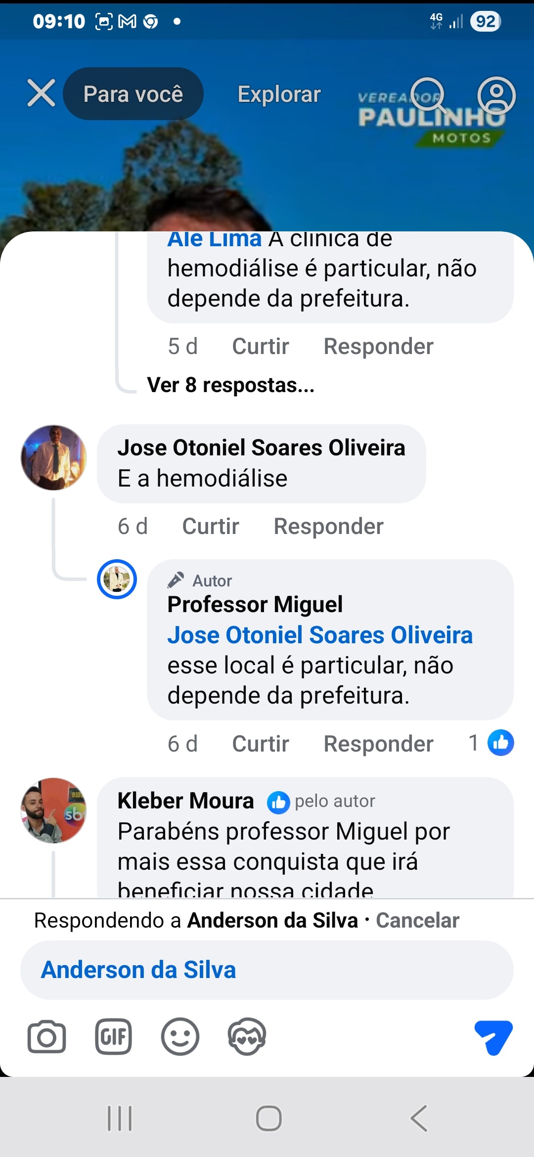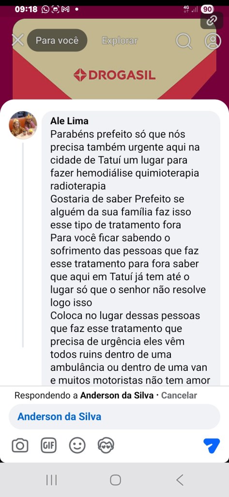 Resposta do prefeito: “A clínica de hemodiálise é particular, não depende da prefeitura”. (print anexo).