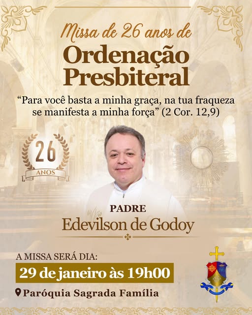 Nesta quinta-feira (29), 19 horas, uma missa na Igreja Sagrada Família, na Avenida das Mangueiras, em Tatuí, celebra 26 anos de Ordenação Presbiterial do padre Edvilson de Godoy. Ele é pároco dessa comunidade católica e seu trabalho ampliou o espaço onde foi construída a igreja, com a compra de mais dois imóveis. Sua administração paroquial promove festas que envolvem toda a comunidade e suas celebrações litúrgicas são sempre lotadas de fieis.