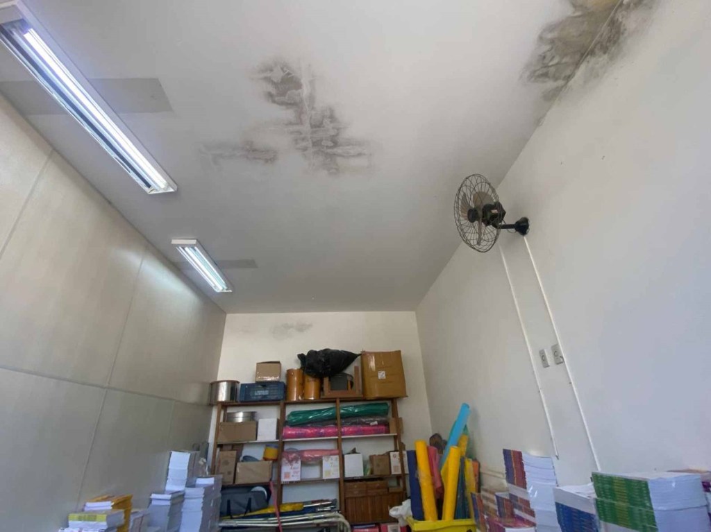 Indícios de infiltração e mofo na sala de armazenamento de material pedagógico – Pilar do Sul (Crédito: Divulgação/TCESP)