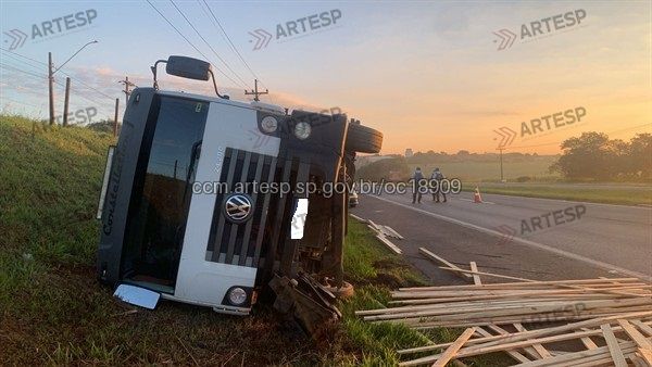 CAPOTAMENTO – Dia 14 de abril, de manhã, um caminhão, carregado de madeira, capotou no KM 109 da Rodovia SP-127 (Tatuí/Cerquilho). A carga ficou espalhada pela pista e houve transtorno no trafego. Foto: Artesp.
